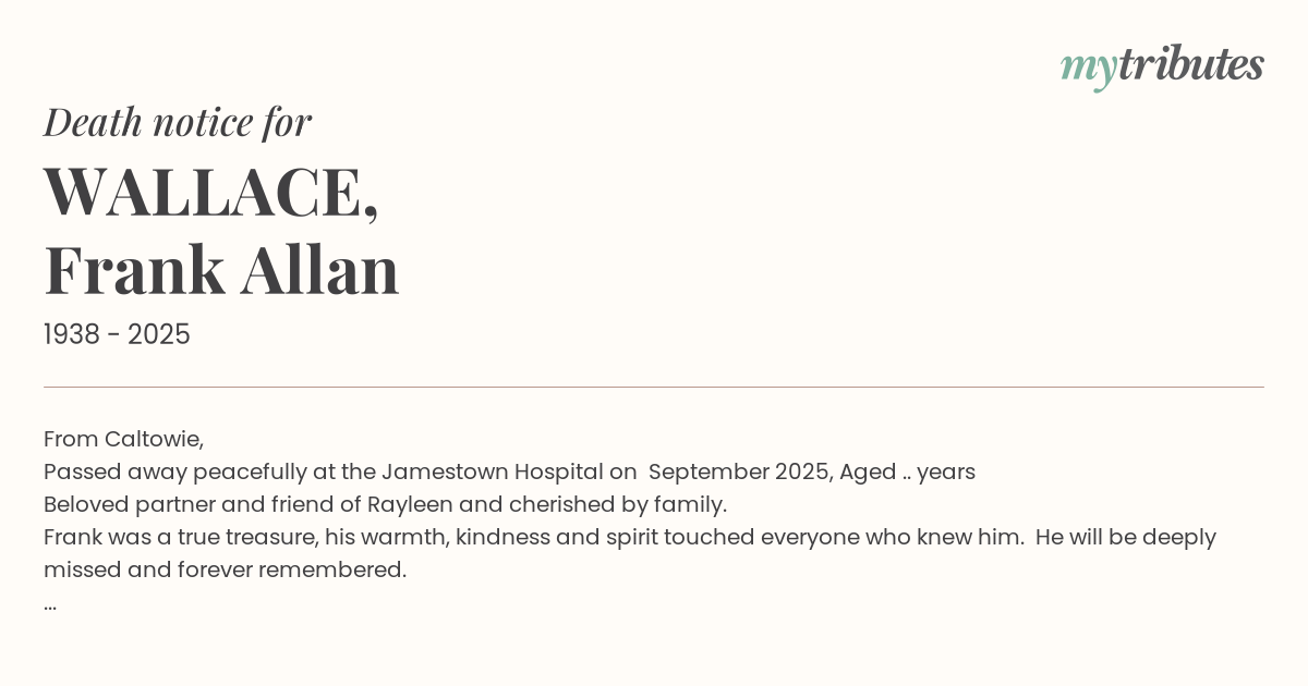 Passed away peacefully at the Jamestown Hospital on … September 2025, Aged ….. years