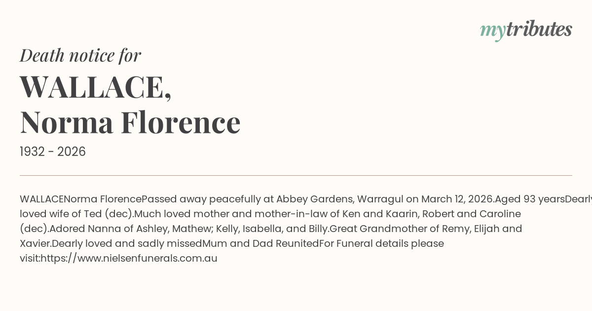 Dearly loved wife of Ted (dec). Much loved mother and mother-in-law of Ken and Kaarin, Robert and Caroline (dec). Adored Nanna of Ashley, Mathew; Kelly, Isabella, and Billy. Great Grandmother of Remy, Elijah and Xavier.