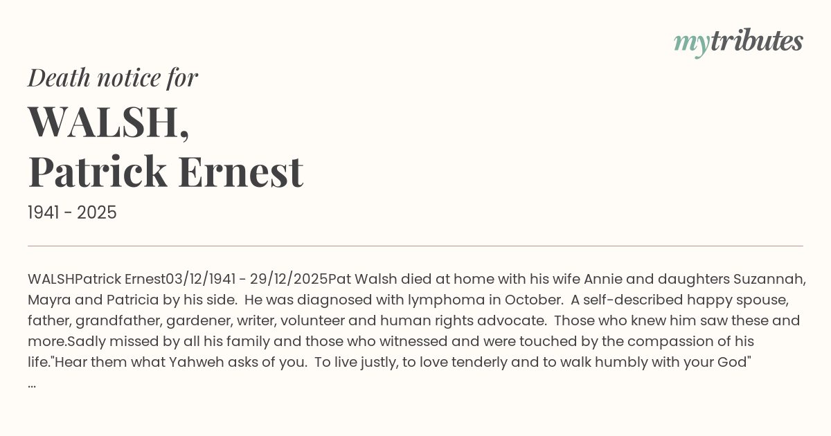 Pat Walsh died at home with his wife Annie and daughters Suzannah, Mayra and Patricia by his side. He was diagnosed with lymphoma in October. A self-described ‘happy spouse, father, grandfather, gardener, writer, volunteer and human rights advocate’. Those who knew him saw these and more.