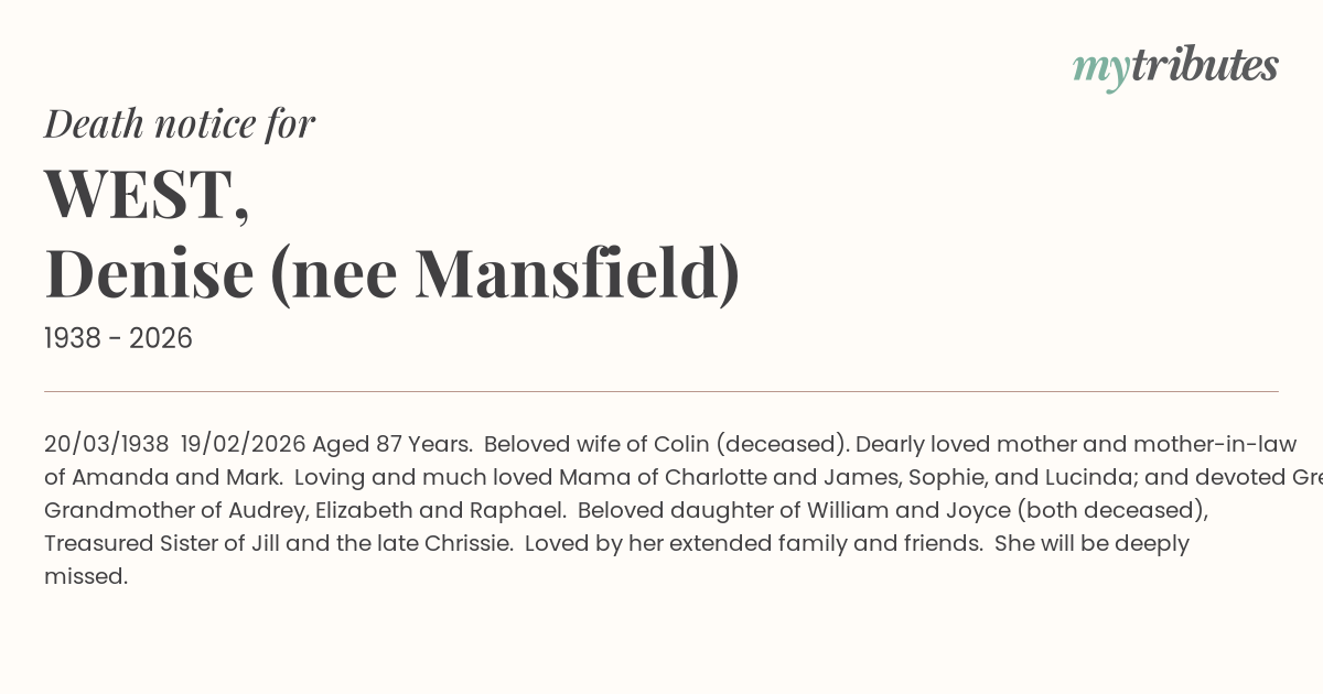 17°C20/03/1938 – 19/02/2026 Aged 87 Years. Beloved wife of Colin (deceased). Dearly loved mother and mother-in-law of Amanda and Mark. Loving and much loved Mama of Charlotte and James, Sophie, and Lucinda; and devoted Great Grandmother of Audrey, Elizabeth and Raphael. Beloved daughter of William and Joyce (both deceased), Treasured Sister of Jill and the late Chrissie. Loved by her extended family and friends. She will be deeply missed.