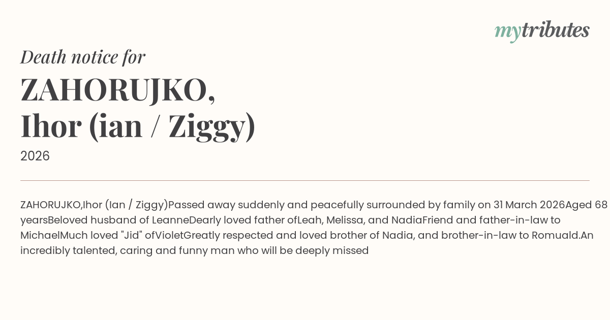 Passed away suddenly and peacefully surrounded by family on 31 March 2026