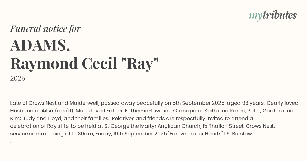 Relatives and friends are respectfully invited to attend a celebration of Ray's life, to be held at St George the Martyr Anglican Church, 15 Thallon Street, Crows Nest, service commencing at 10:30am, Friday, 19th September 2025.