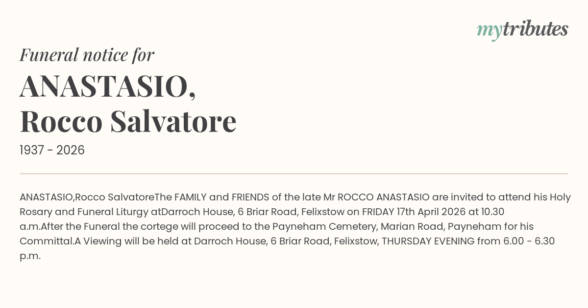 The FAMILY and FRIENDS of the late Mr ROCCO ANASTASIO are invited to attend his Holy Rosary and Funeral Liturgy at