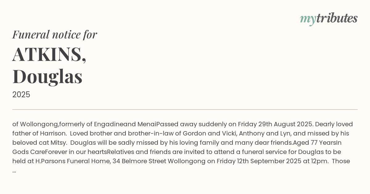 Passed away suddenly on Friday 29th August 2025. Dearly loved father of Harrison. Loved brother and brother-in-law of Gordon and Vicki, Anthony and Lyn, and missed by his beloved cat Mitsy. Douglas will be sadly missed by his loving family and many dear friends.