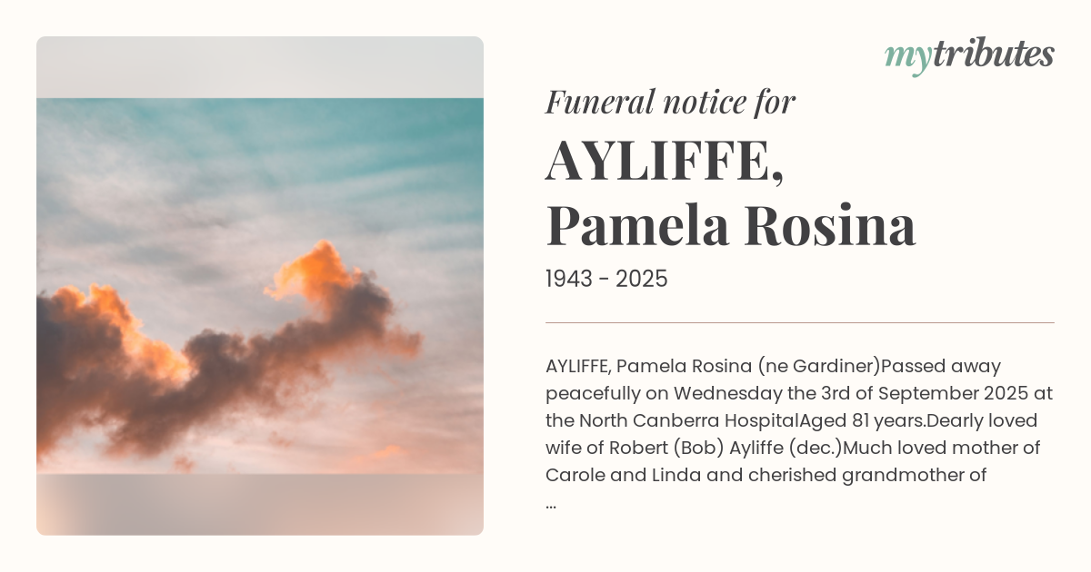 In lieu of flowers, donations to Dementia Australia (https://donate.dementia.org.au/memory#Donation) in the name of Pamela Ayliffe will be appreciated.