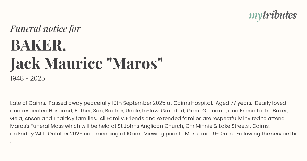 17°CLate of Cairns. Passed away peacefully 19th September 2025 at Cairns Hospital. Aged 77 years.