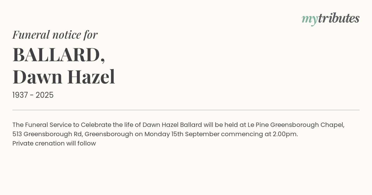 17°CThe Funeral Service to Celebrate the life of Dawn Hazel Ballard will be held at Le Pine Greensborough Chapel, 513 Greensborough Rd, Greensborough on Monday 15th September commencing at 2.00pm.