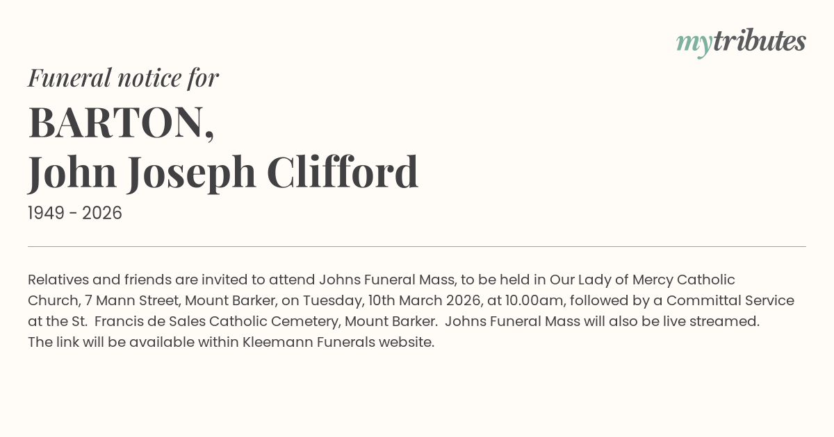17°CRelatives and friends are invited to attend John’s Funeral Mass, to be held in Our Lady of Mercy Catholic Church, 7 Mann Street, Mount Barker, on Tuesday, 10th March 2026, at 10.00am, followed by a Committal Service at the St. Francis de Sales Catholic Cemetery, Mount Barker. John’s Funeral Mass will also be live streamed. The link will be available within Kleemann Funerals website.