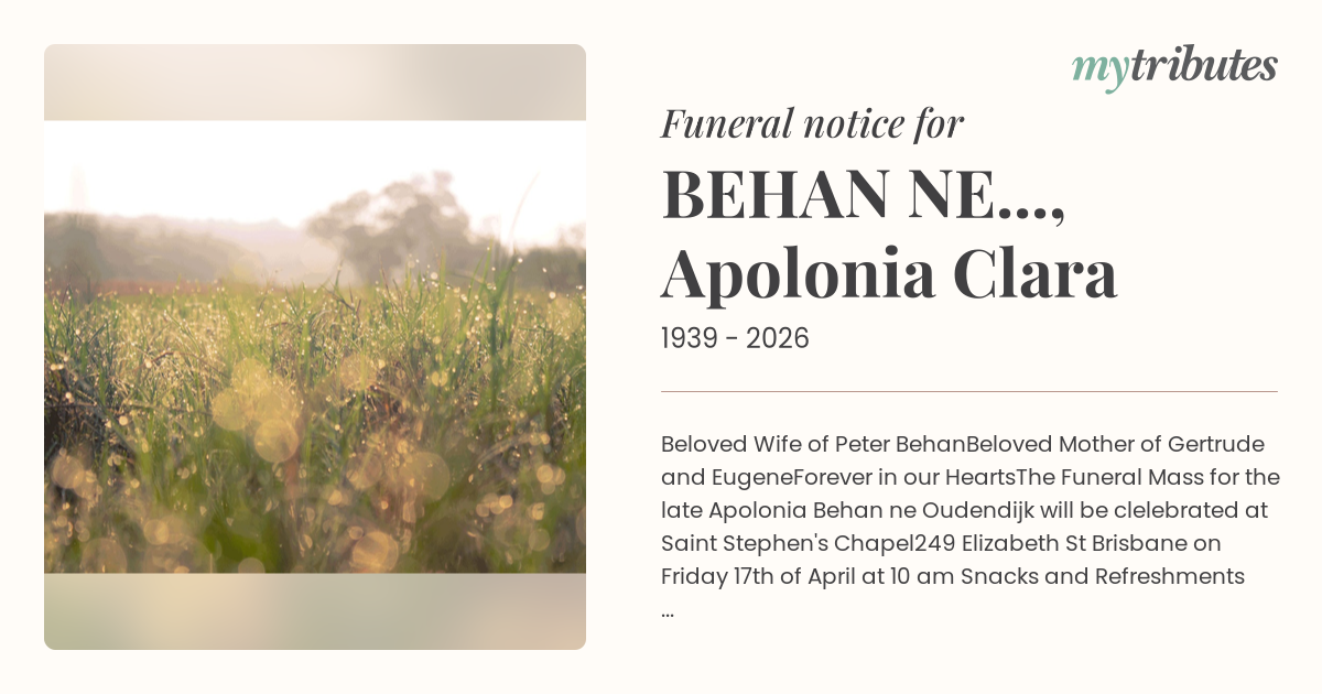 The Funeral Mass for the late Apolonia Behan née Oudendijk will be clelebrated at Saint Stephen's Chapel
