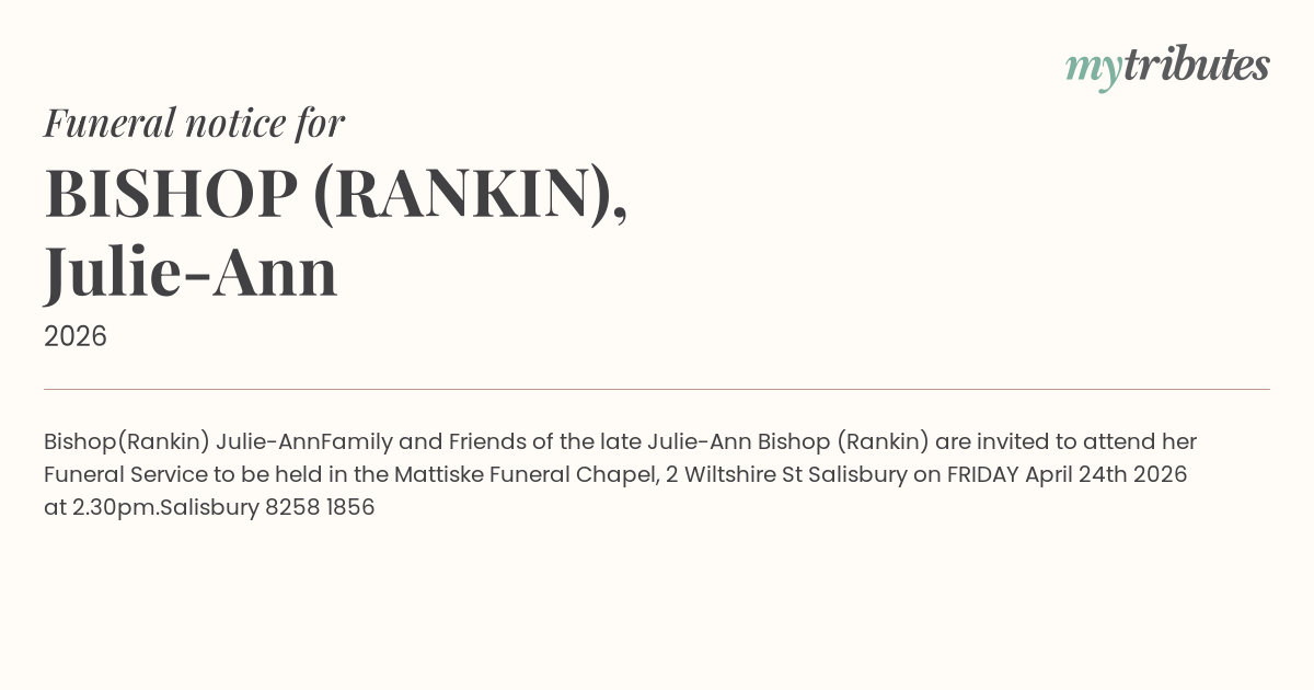 Family and Friends of the late Julie-Ann Bishop (Rankin) are invited to attend her Funeral Service to be held in the Mattiske Funeral Chapel, 2 Wiltshire St Salisbury on FRIDAY April 24th 2026