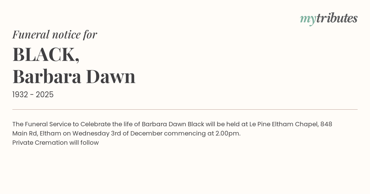 17°CThe Funeral Service to Celebrate the life of Barbara Dawn Black will be held at Le Pine Eltham Chapel, 848 Main Rd, Eltham on Wednesday 3rd of December commencing at 2.00pm.