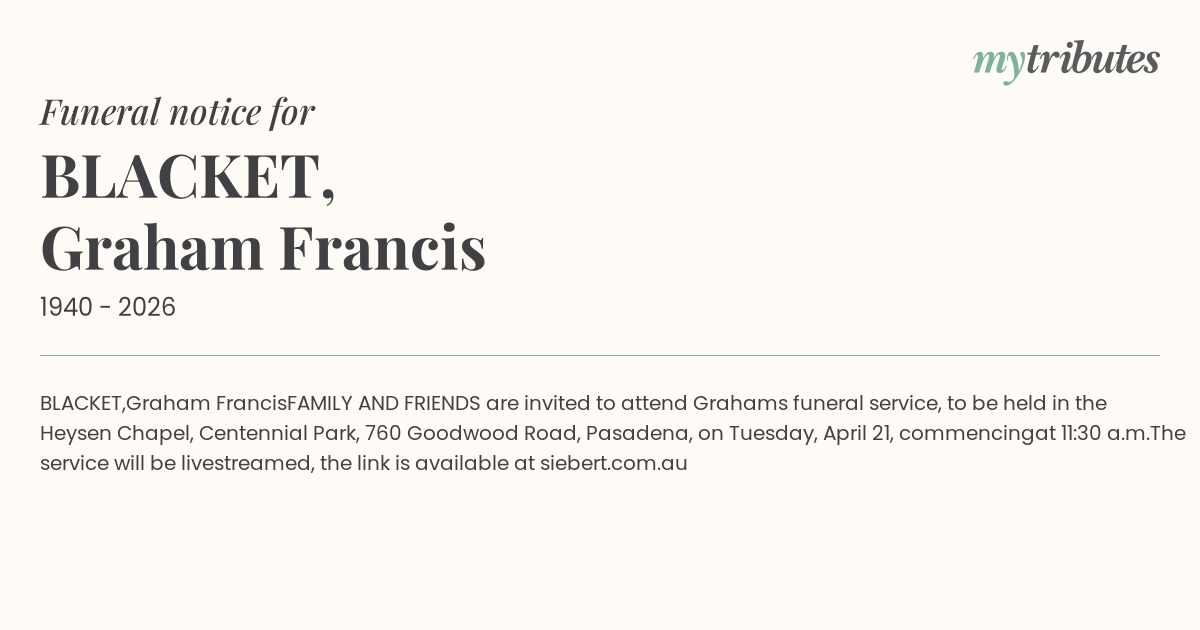 FAMILY AND FRIENDS are invited to attend Graham’s funeral service, to be held in the Heysen Chapel, Centennial Park, 760 Goodwood Road, Pasadena, on Tuesday, April 21, commencing