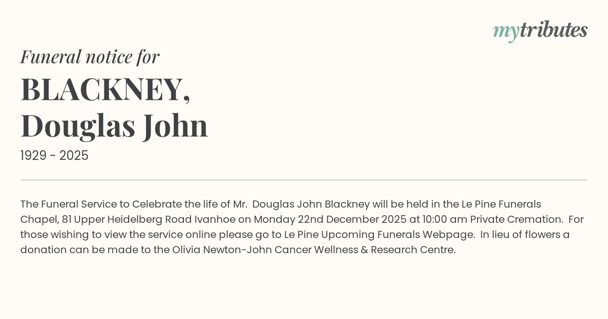 17°CThe Funeral Service to Celebrate the life of Mr. Douglas John Blackney will be held in the Le Pine Funerals Chapel, 81 Upper Heidelberg Road Ivanhoe on Monday 22nd December 2025 at 10:00 am Private Cremation. For those wishing to view the service online please go to Le Pine Upcoming Funerals Webpage. In lieu of flowers a donation can be made to the Olivia Newton-John Cancer Wellness & Research Centre.