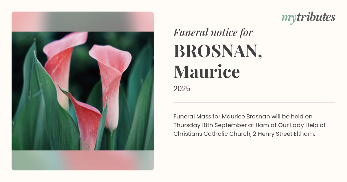 17°CFuneral Mass for Maurice Brosnan will be held on Thursday 18th September at 11am at Our Lady Help of Christians Catholic Church, 2 Henry Street Eltham.