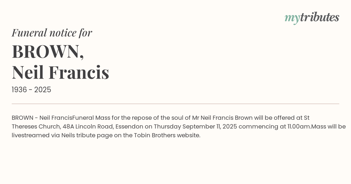 Funeral Mass for the repose of the soul of Mr Neil Francis Brown will be offered at St Therese’s Church, 48A Lincoln Road, Essendon on Thursday September 11, 2025 commencing at 11.00am.