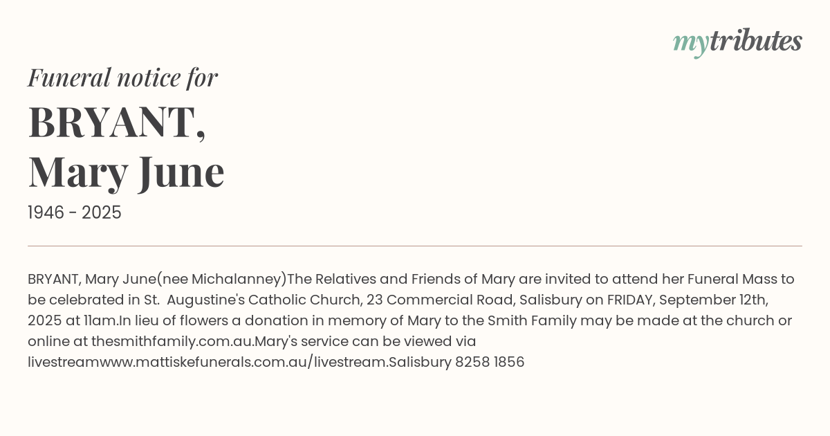 In lieu of flowers a donation in memory of Mary to the Smith Family may be made at the church or online at thesmithfamily.com.au.