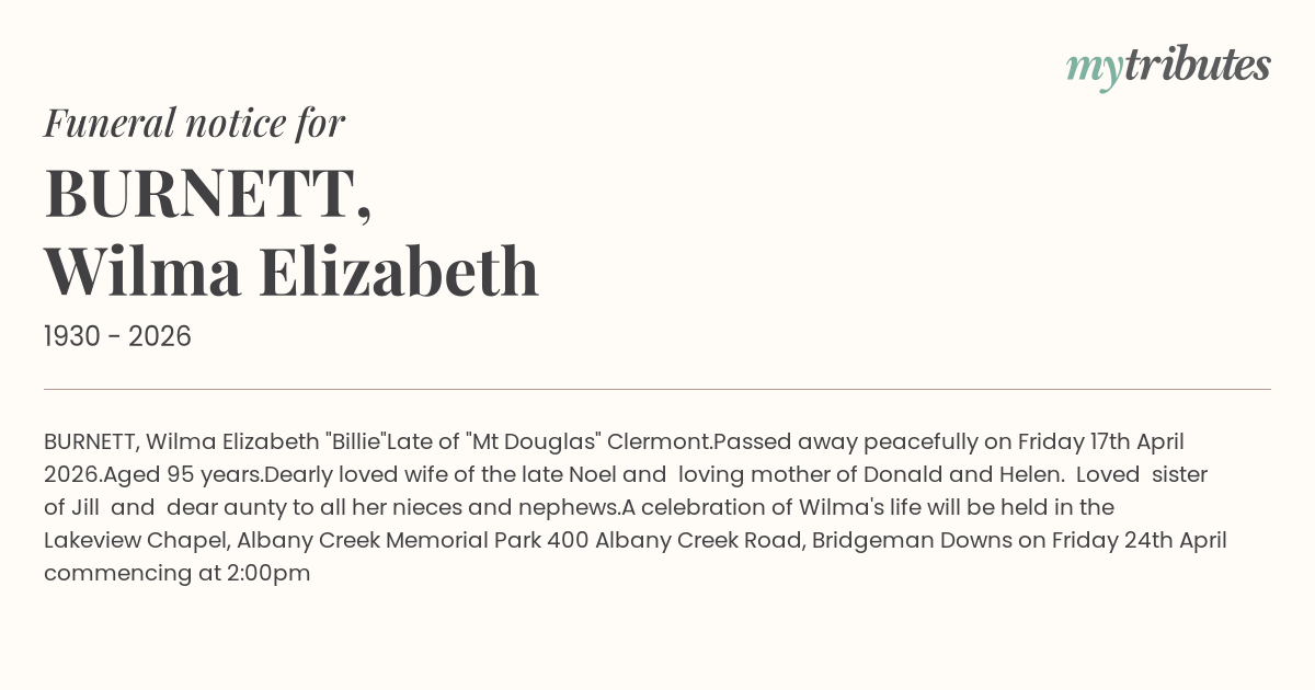 A celebration of Wilma's life will be held in the Lakeview Chapel, Albany Creek Memorial Park 400 Albany Creek Road, Bridgeman Downs on Friday 24th April commencing at 2:00pm