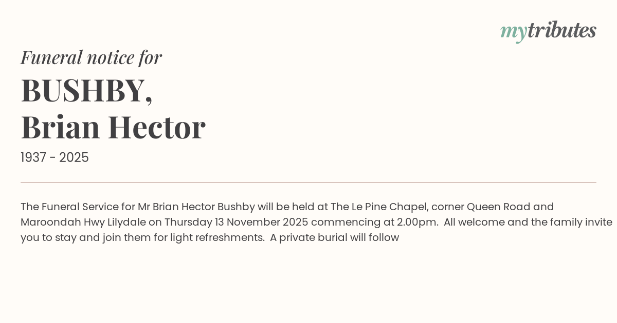 17°CThe Funeral Service for Mr Brian Hector Bushby will be held at The Le Pine Chapel, corner Queen Road and Maroondah Hwy Lilydale on Thursday 13 November 2025 commencing at 2.00pm. All welcome and the family invite you to stay and join them for light refreshments. A private burial will follow