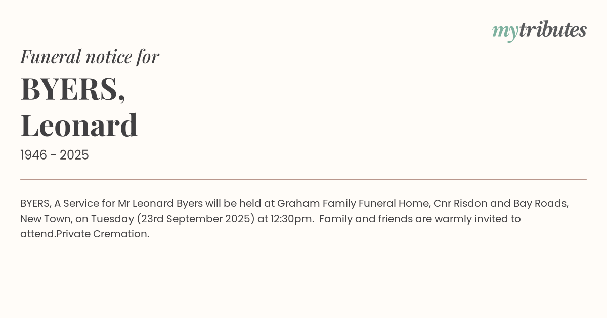 17°CBYERS, A Service for Mr Leonard Byers will be held at Graham Family Funeral Home, Cnr Risdon and Bay Roads, New Town, on Tuesday (23rd September 2025) at 12:30pm. Family and friends are warmly invited to attend.