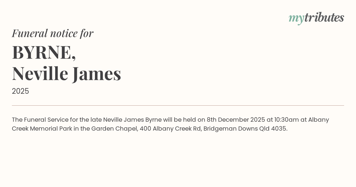 17°CThe Funeral Service for the late Neville James Byrne will be held on 8th December 2025 at 10:30am at Albany Creek Memorial Park in the Garden Chapel, 400 Albany Creek Rd, Bridgeman Downs Qld 4035.