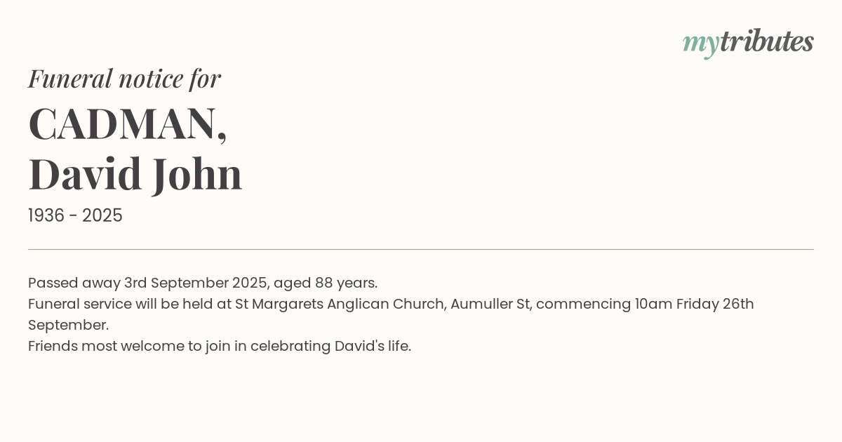 Funeral service will be held at St Margaret’s Anglican Church, Aumuller St, commencing 10am Friday 26th September.