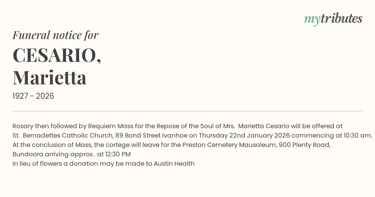 17°CRosary then followed by Requiem Mass for the Repose of the Soul of Mrs. Marietta Cesario will be offered at St. Bernadette’s Catholic Church, 89 Bond Street Ivanhoe on Thursday 22nd January 2026 commencing at 10:30 am.
