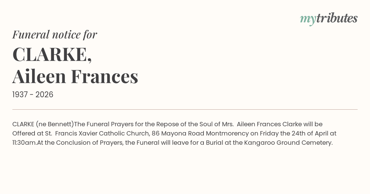 The Funeral Prayers for the Repose of the Soul of Mrs. Aileen Frances Clarke will be Offered at St. Francis Xavier Catholic Church, 86 Mayona Road Montmorency on Friday the 24th of April at 11:30am.