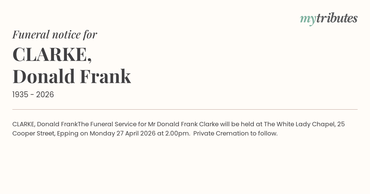 Mr Donald Frank Clarke will be held at The White Lady Chapel, 25 Cooper Street, Epping on Monday 27 April 2026 at 2.00pm.