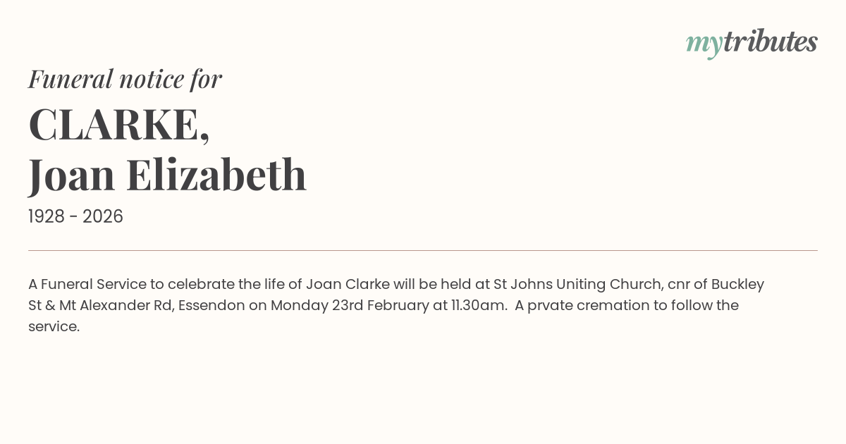 17°CA Funeral Service to celebrate the life of Joan Clarke will be held at St Johns Uniting Church, cnr of Buckley St & Mt Alexander Rd, Essendon on Monday 23rd February at 11.30am. A prvate cremation to follow the service.