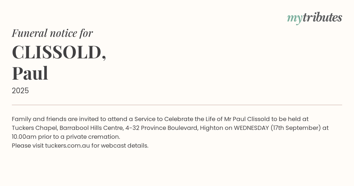 17°CFamily and friends are invited to attend a Service to Celebrate the Life of Mr Paul Clissold to be held at Tuckers Chapel, Barrabool Hills Centre, 4-32 Province Boulevard, Highton on WEDNESDAY (17th September) at 10.00am prior to a private cremation.