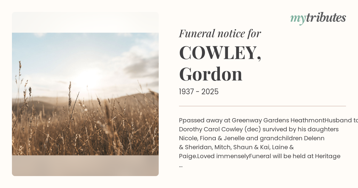 17°CHusband to Dorothy “Carol” Cowley (dec) survived by his daughters Nicole, Fiona & Jenelle and grandchildren Delenn & Sheridan, Mitch, Shaun & Kai, Laine & Paige.