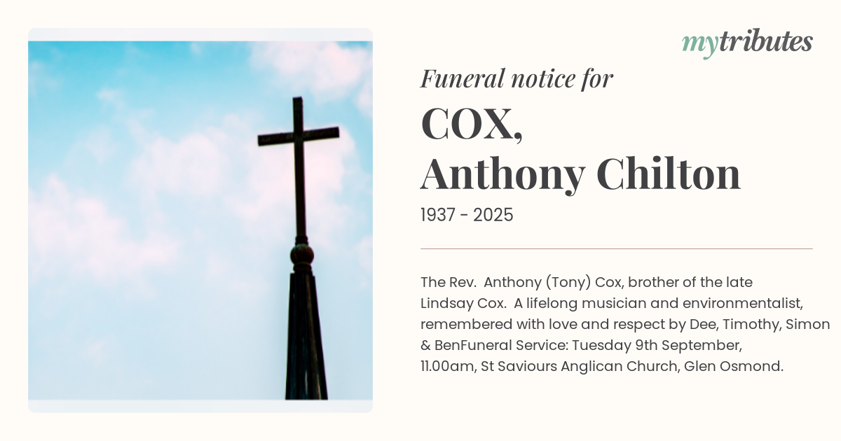 17°CThe Rev. Anthony (Tony) Cox, brother of the late Lindsay Cox.