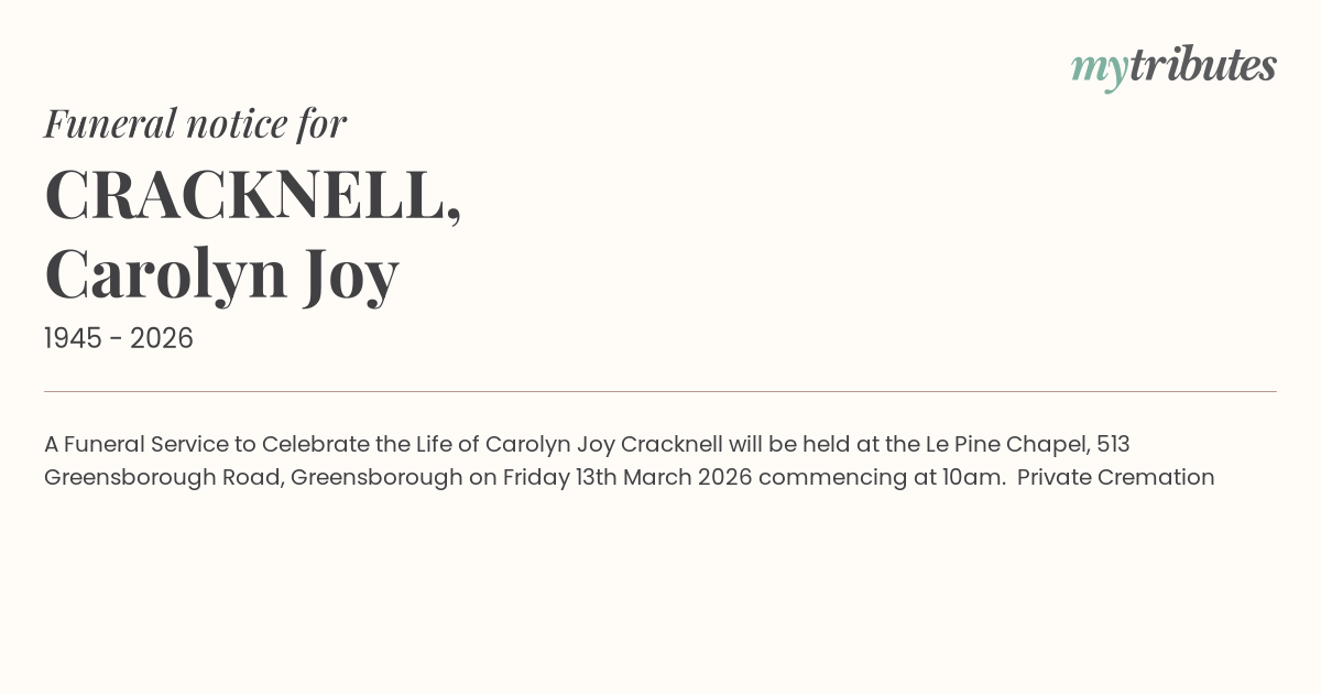 17°CA Funeral Service to Celebrate the Life of Carolyn Joy Cracknell will be held at the Le Pine Chapel, 513 Greensborough Road, Greensborough on Friday 13th March 2026 commencing at 10am. Private Cremation
