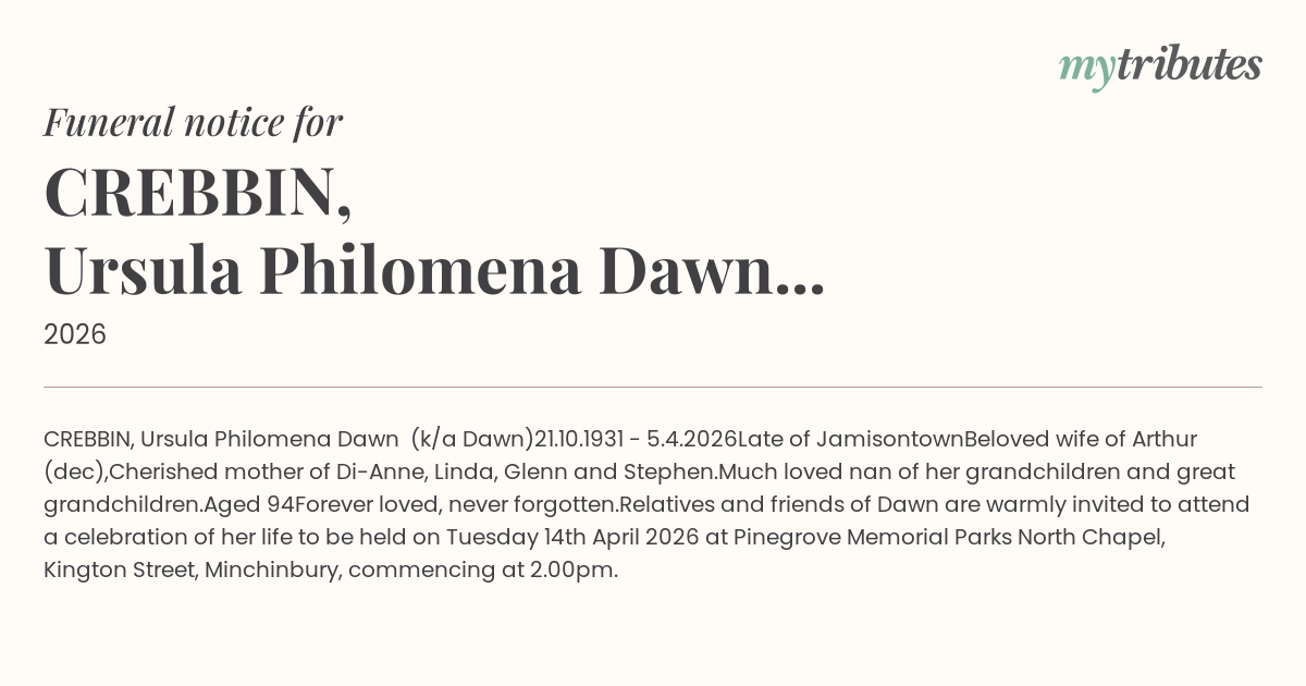 celebration of her life to be held on Tuesday 14th April 2026