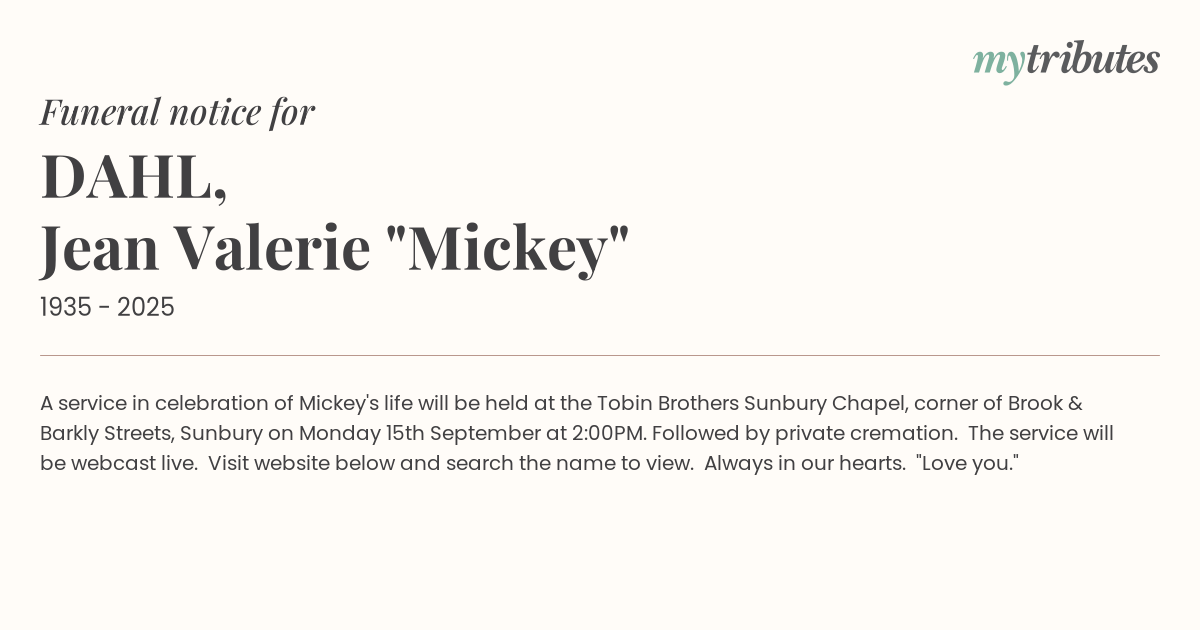 17°CA service in celebration of Mickey's life will be held at the Tobin Brothers Sunbury Chapel, corner of Brook & Barkly Streets, Sunbury on Monday 15th September at 2:00PM. Followed by private cremation. The service will be webcast live. Visit website below and search the name to view. Always in our hearts. "Love you."
