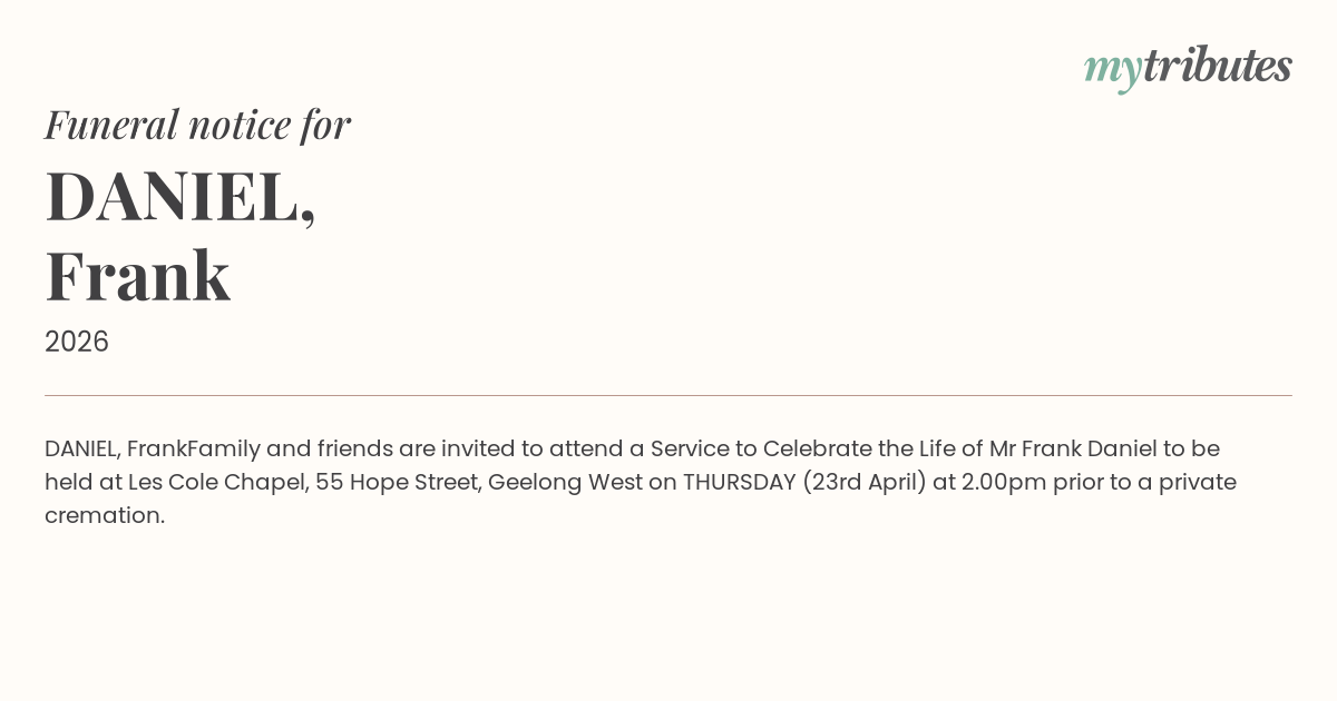 Family and friends are invited to attend a Service to Celebrate the Life of Mr Frank Daniel to be held at Les Cole Chapel, 55 Hope Street, Geelong West on THURSDAY (23rd April) at 2.00pm prior to a private cremation.
