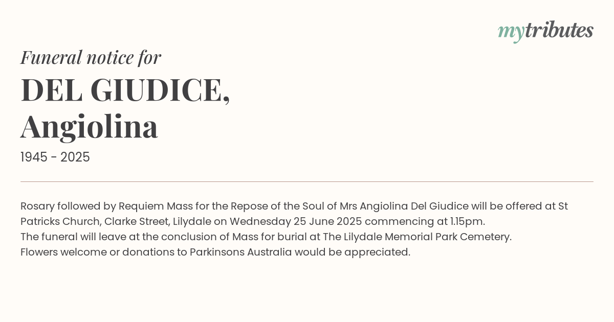 17°CRosary followed by Requiem Mass for the Repose of the Soul of Mrs Angiolina Del Giudice will be offered at St Patrick’s Church, Clarke Street, Lilydale on Wednesday 25 June 2025 commencing at 1.15pm.