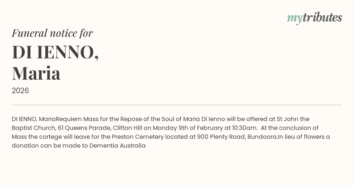 Requiem Mass for the Repose of the Soul of Maria Di Ienno will be offered at St John the Baptist Church, 61 Queens Parade, Clifton Hill on Monday 9th of February at 10:30am. At the conclusion of Mass the cortege will leave for the Preston Cemetery located at 900 Plenty Road, Bundoora.