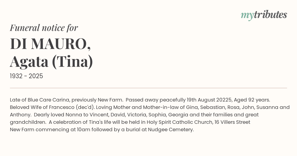 17°CLate of Blue Care Carina, previously New Farm. Passed away peacefully 19th August 20225, Aged 92 years. Beloved Wife of Francesco (dec'd). Loving Mother and Mother-in-law of Gina, Sebastian, Rosa, John, Susanna and Anthony. Dearly loved Nonna to Vincent, David, Victoria, Sophia, Georgia and their families and great grandchildren. A celebration of Tina's life will be held in Holy Spirit Catholic Church, 16 Villers Street New Farm commencing at 10am followed by a burial at Nudgee Cemetery.