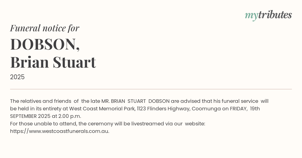 17°CThe relatives and friends of the late MR. BRIAN STUART DOBSON are advised that his funeral service will be held in its entirety at West Coast Memorial Park, 1123 Flinders Highway, Coomunga on FRIDAY, 19th SEPTEMBER 2025 at 2.00 p.m.