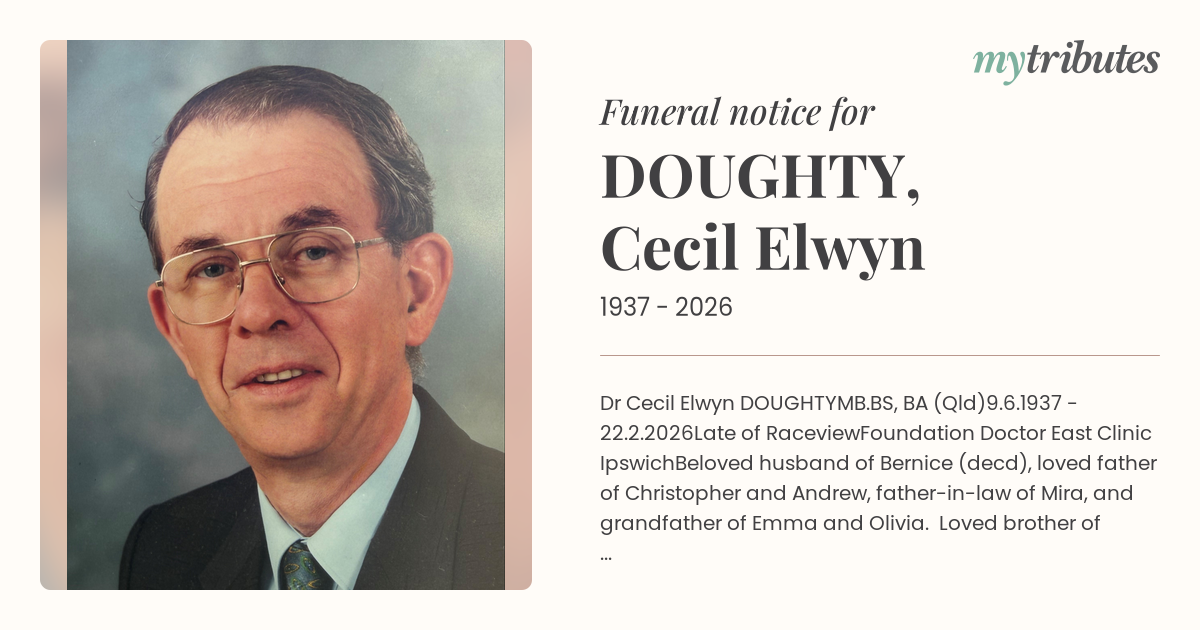 Family and friends are invited to attend a service to remember the life of Cecil to be held at 11am Thursday 5th March 2026 in St. Mary’s Catholic Church, Elizabeth Street, Ipswich, followed by burial and refreshments at Centenary Memorial Gardens, 353 Wacol Station Road, Sumner.
