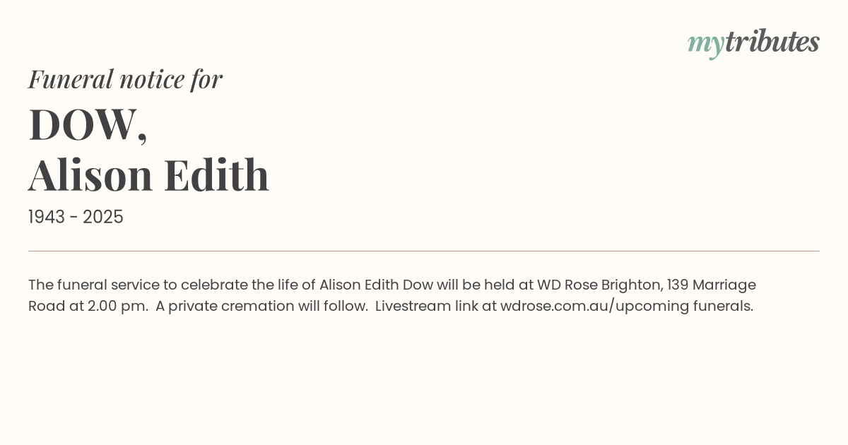 17°CThe funeral service to celebrate the life of Alison Edith Dow will be held at WD Rose Brighton, 139 Marriage Road at 2.00 pm. A private cremation will follow. Livestream link at wdrose.com.au/upcoming funerals.