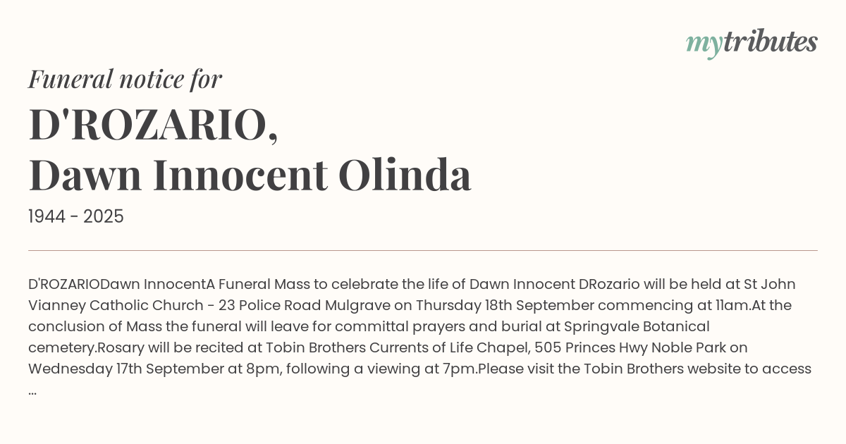Dawn Innocent D’Rozario will be held at St John Vianney Catholic Church - 23 Police Road Mulgrave on Thursday 18th September commencing at 11am.