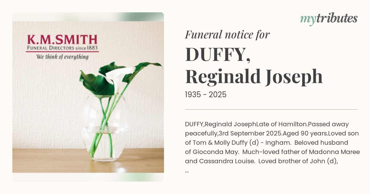 Loved son of Tom & Molly Duffy (d) - Ingham. Beloved husband of Gioconda May. Much-loved father of Madonna Maree and Cassandra Louise. Loved brother of John (d), Margaret (d), Tom, Pat (d), Val, and Mary.