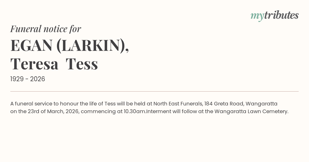 17°CA funeral service to honour the life of Tess will be held at North East Funerals,