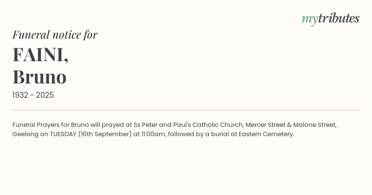 17°CFuneral Prayers for Bruno will prayed at Ss Peter and Paul's Catholic Church, Mercer Street & Malone Street, Geelong on TUESDAY (16th September) at 11.00am, followed by a burial at Eastern Cemetery.