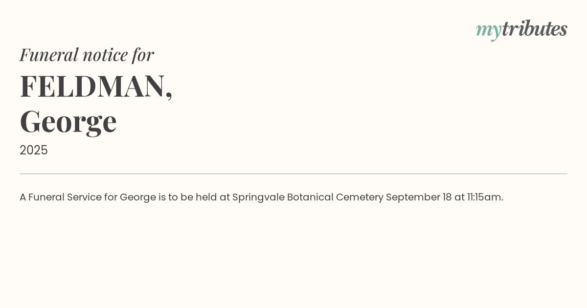 17°CA Funeral Service for George is to be held at Springvale Botanical Cemetery September 18 at 11:15am.