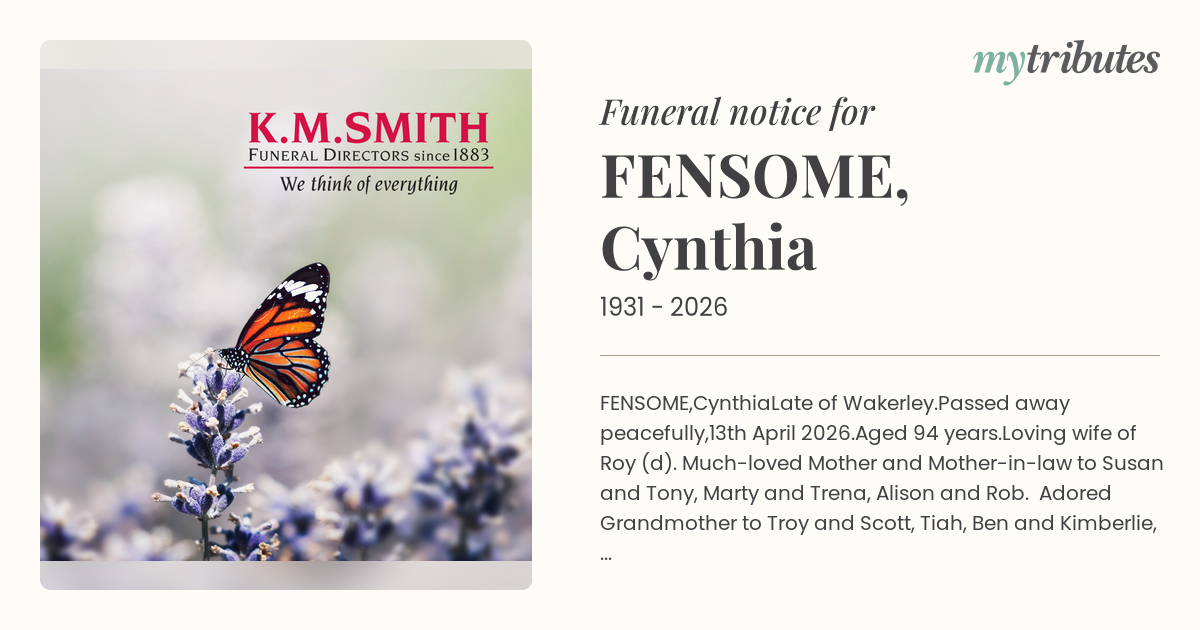Family and friends are invited to attend the funeral service to celebrate Cynthia's life at Hemmant Chapel, 500 Hemmant Tingalpa Road, Hemmant, on Friday 24th April, commencing at 9.30 a.m.