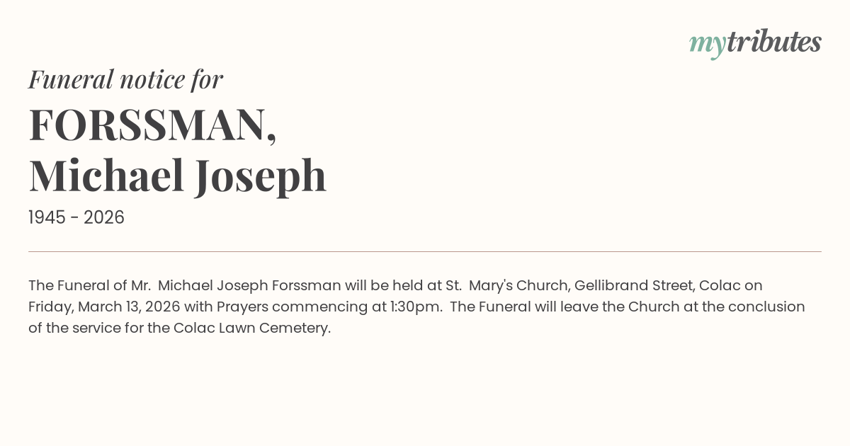 17°CThe Funeral of Mr. Michael Joseph Forssman will be held at St. Mary's Church, Gellibrand Street, Colac on Friday, March 13, 2026 with Prayers commencing at 1:30pm. The Funeral will leave the Church at the conclusion of the service for the Colac Lawn Cemetery.