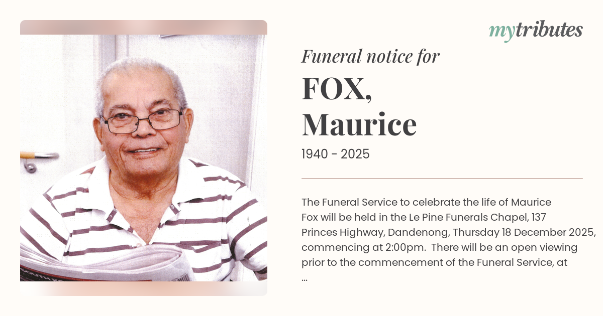 17°CThe Funeral Service to celebrate the life of Maurice Fox will be held in the Le Pine Funerals Chapel, 137 Princes Highway, Dandenong, Thursday 18 December 2025, commencing at 2:00pm.